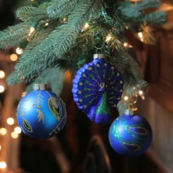 3ct Royal Blue And Green Peacock Glass Christmas Ornaments 3.75″ (95mm)