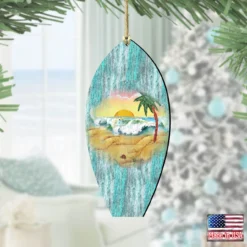 Set Of 2 Surfboard Beach Scene Wooden Christmas Ornaments 5.5″
