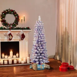 4.5′ Pre-Lit Pencil Flocked Purple Artificial Christmas Tree, Clear Lights