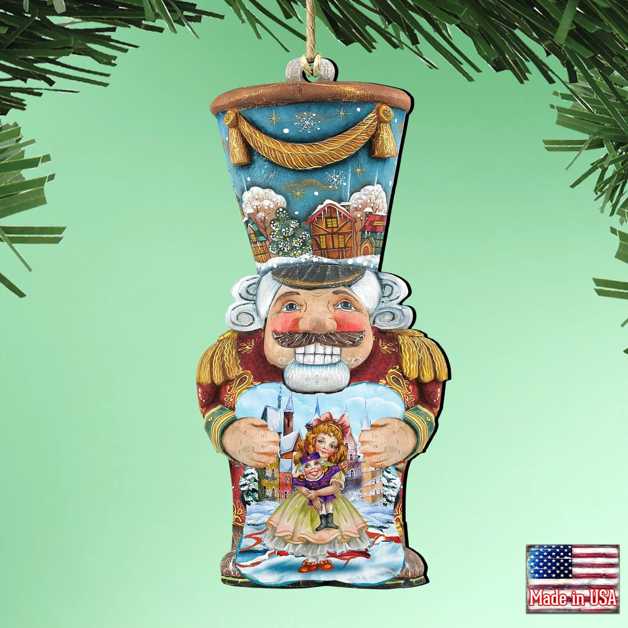 Ornaments depict a Nutcracker presenting an image of a girl with a soldier