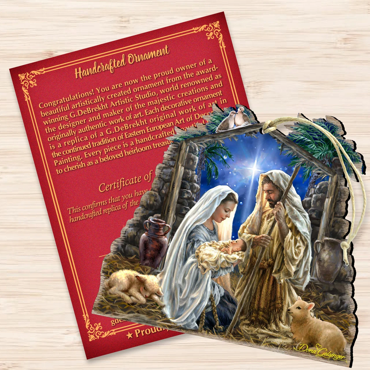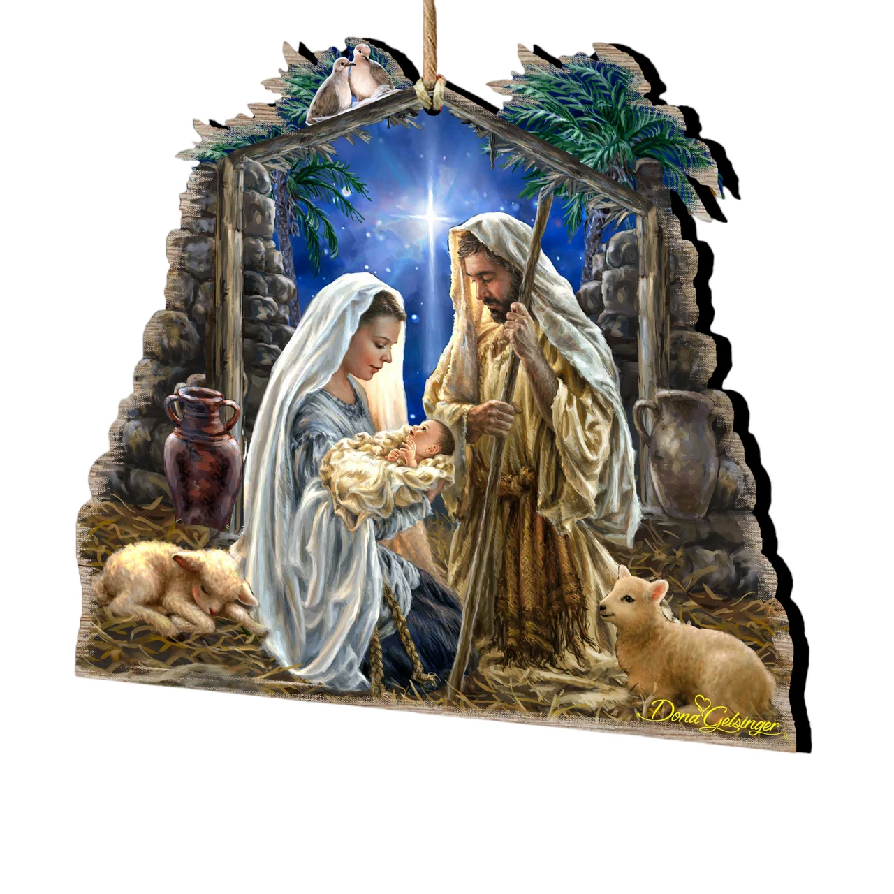 Ornaments depict a nativity scene with two sheep